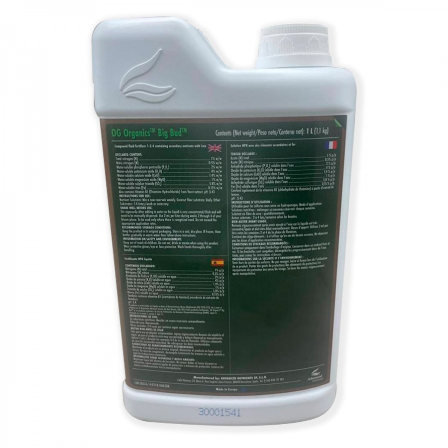 ✅ OG Organics Big Bud — это первоклассная органическая фосфоро-калийная добавка с улучшенной формулой, которую подкрепляют: очень эффективный бестселлер гидролизата рыбного белка (способствует набуханию бутонов), лигносульфонат кальция, комплекс аминокислот, железо, магний и сера. Компания Advanced Nutrients предлагает вашим высокоценным культурам надежное меню микроэлементов, которые подпитывают продуктивную стадию цветения.