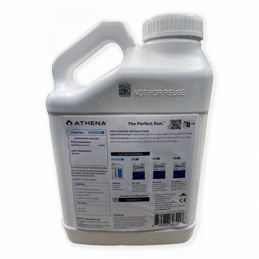 Athena Cleanse изготовлен на основе хлорноватистой кислоты. Эта мягкая кислота получается из соли с использованием запатентованного процесса электрохимической обработки. Результатом является уникальное, безопасное для растений вещество с мощными окислительными свойствами, которое предотвращает накопление минералов, повышает окислительно-восстановительный потенциал (ОВП) и удаляет накипь из ирригационных систем.
