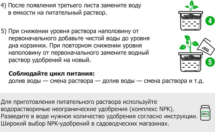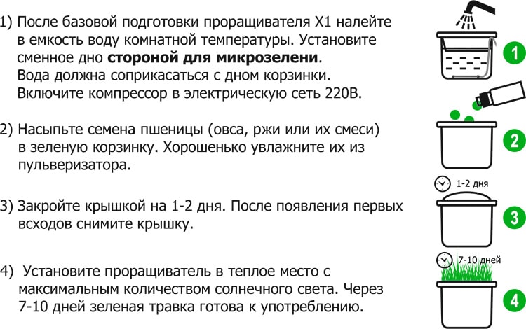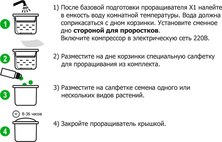 Меры предосторожности:1) Соблюдайте основные правила безопасности при работе с включенными электроприборами и водой. 2) Не допускайте детей к прибору и его сетевому проводу. 3) Перед обслуживанием и уходом выключайте компрессор из электрической сети 220 В. 4) При отключении компрессора от электрической сети обязательно отсоедините шланг для воздуха от компрессора, чтобы избежать вероятность попадания воды через шланг внутрь компрессора. Уход за прибором.После каждого цикла проращивания тщательно промывайте емкость для жидкости, корзинку для семян губкой или мягкой щеткой. Не применяйте абразивные чистящие вещества. В случае загрязнения распылителя воздуха снижается прохождение воздуха. Промойте его щеткой. При сильном загрязнении замените на новый (запасной в комплект не входит). Как вырастить микрозелень с помощью Домашнего АэроСАДа?